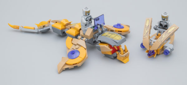 Du côté des méchants, le Leviathan à construire est bien loin de rendre hommage à la version du film. Ici, on se contente d'un mini-modèle articulé à la façon d'un serpent ou d'un dragon Ninjago avec un poste de pilotage extérieur. On frôle le Microfighter et c'est un peu dommage pour un set vendu 60 €. La couverture de livre en Trans Purple qui sert ici de HUD n'est pas inédite, elle était déjà livrée dans deux sets The LEGO Movie 2 commercialisés en 2019. L'autre engin fourni permet d'y installer un Chitauri et c'est sans doute l'élément du set le plus fidèle au film.