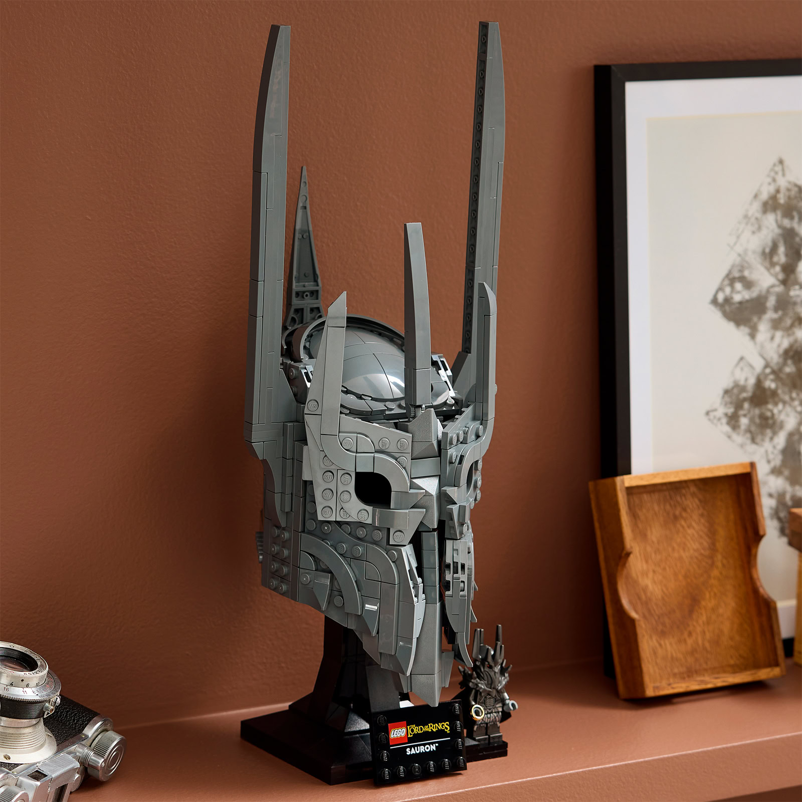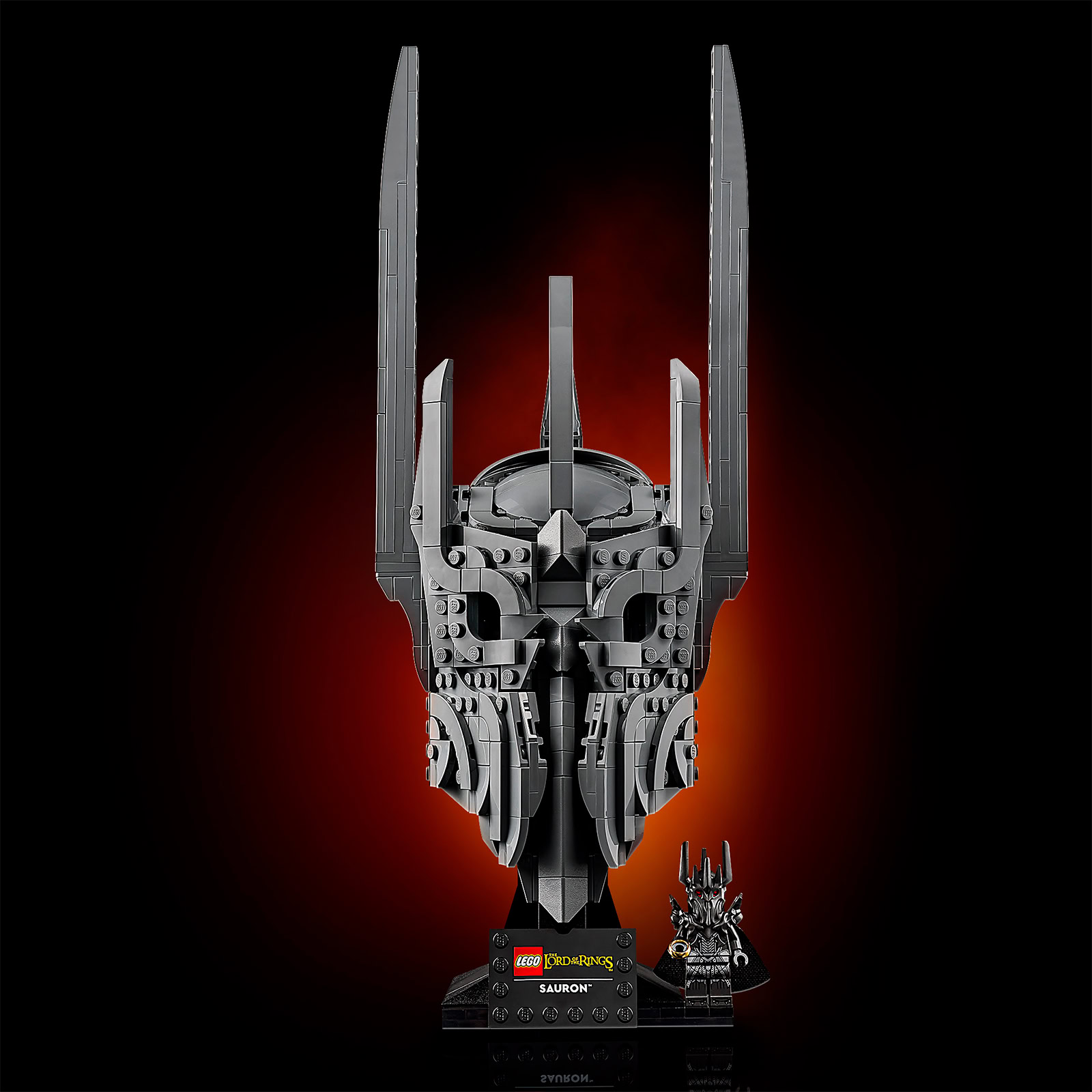 La maquette de 33 cm de haut est accompagnée d'une minifig de Sauron tenant l'Anneau qui reprend au moins le casque, le torse et les jambes de celle vue dans le set LEGO ICONS 10333 The Lord of the Rings : Barad-Dûr.