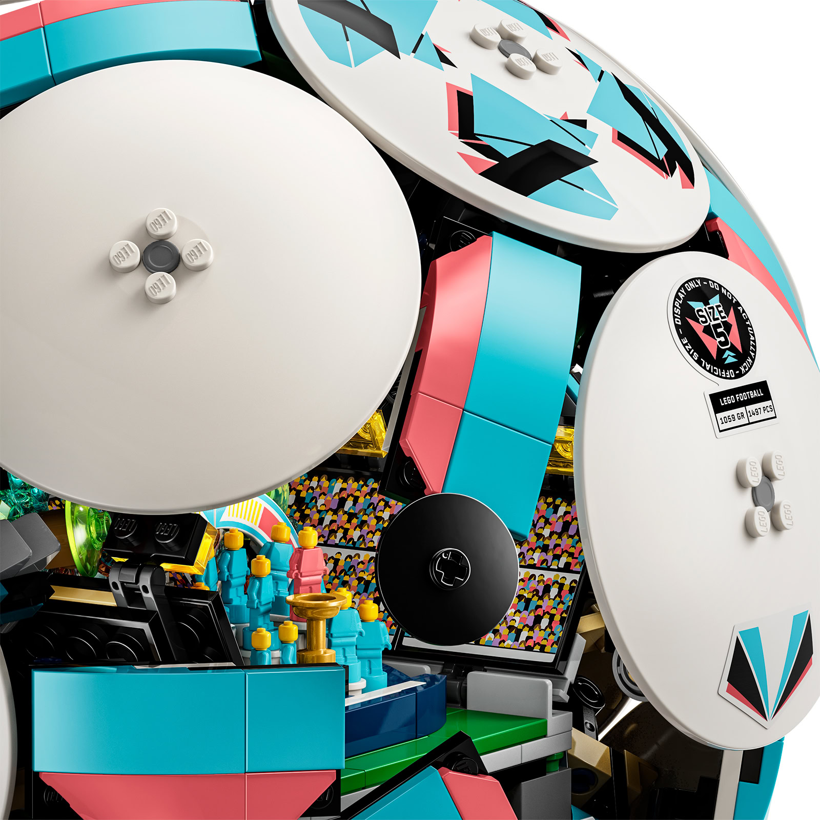 Cette boite de 1498 pièces qui sera elle aussi disponible dès le 1er mars 2026 au prix public de 119,99 € permettra d'assembler un ballon en taille réelle avec à l'intérieur un stade et quelques microfigs célébrant la remise du trophée. la structure interne de ce ballon à l'échelle 1:1 sera composée de quelques éléments issu de l'écosystème Technic qui permettront, sur simple pression d'un bouton, d'ouvrir le ballon.