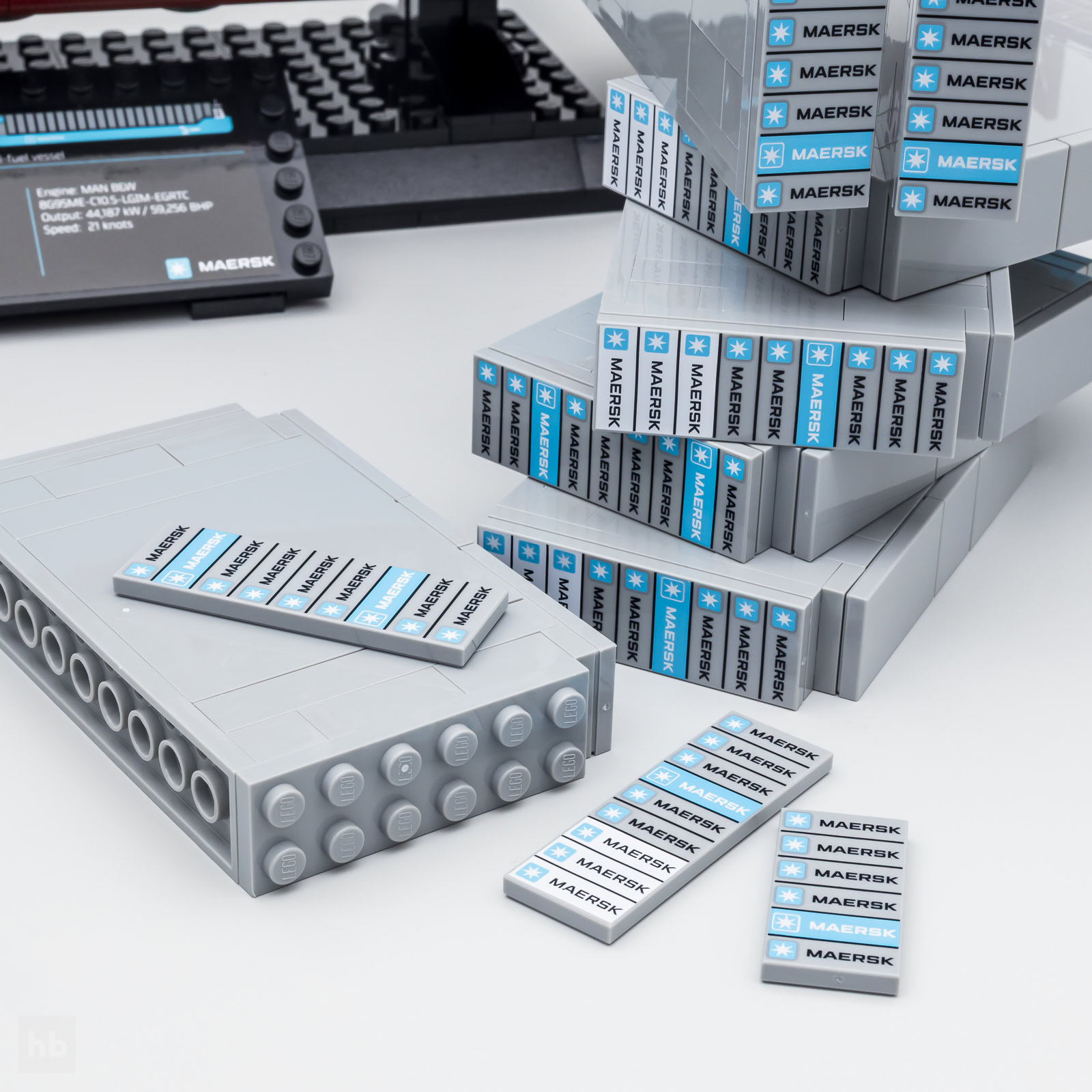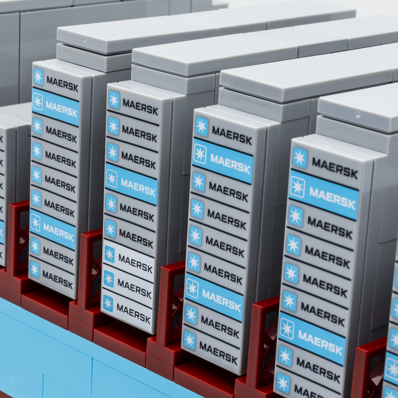 Si la présence des logos Maersk sur le flanc des conteneurs vous stresse, vous pourrez facilement remplacer les Tiles fournies par quelques Tiles colorées pour donner à ce navire un look plus classique. C'est prévu dans la conception du produit avec des rangées de tenons disponibles sur toute la hauteur des piles de conteneurs.