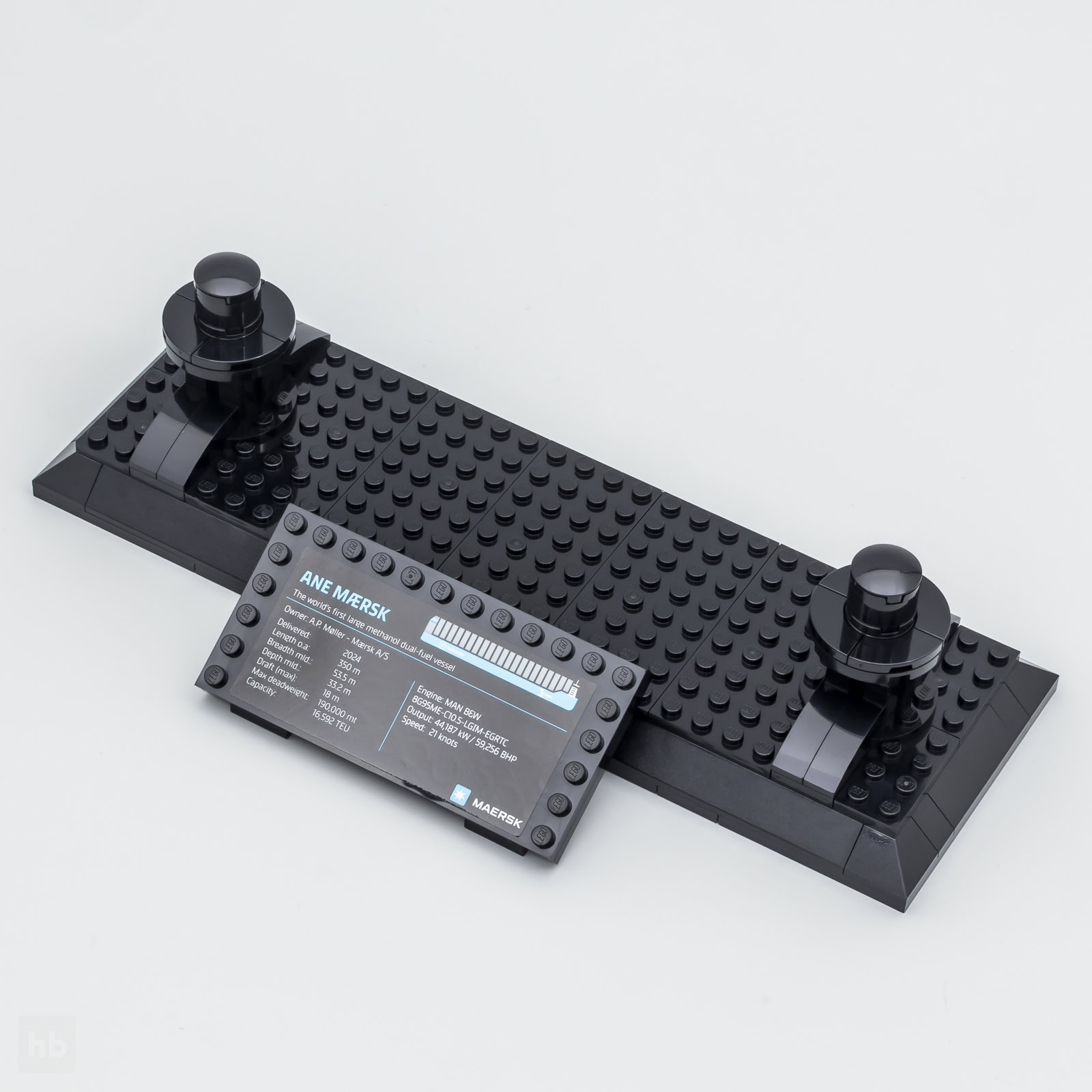 Le présentoir est flanqué d'un joli sticker distillant quelques données techniques à propos du navire, LEGO omettant au passage de citer clairement le nom complet du fabricant du moteur (l'association entre Hyundai et MAN) sans qu'on sache trop pourquoi.