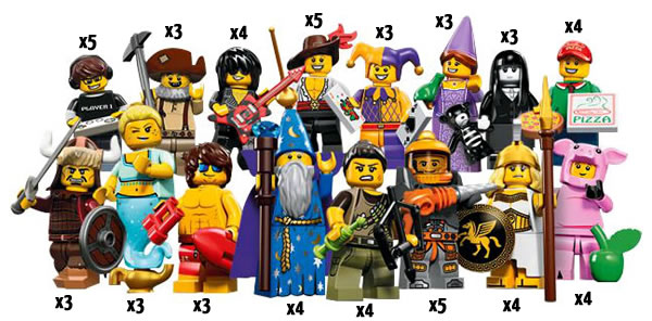 Un joli dessin valant mieux qu'un long discours, je vous ai résumé ci-dessus le contenu de la boite de 60 sachets de minifigs de la série 12 dont la review a été postée sur Eurobricks.
