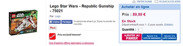 Une offre post-Noël intéressante chez Toys R Us avec le set 75021 Republic Gunship à 89.99 € et en stock.