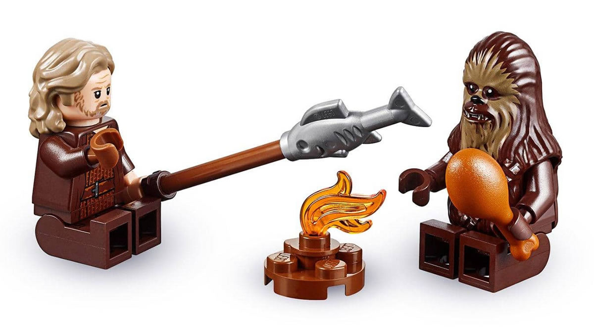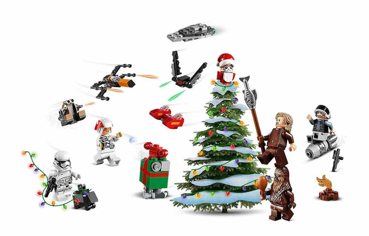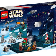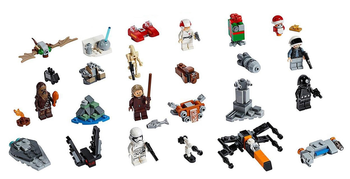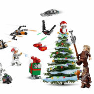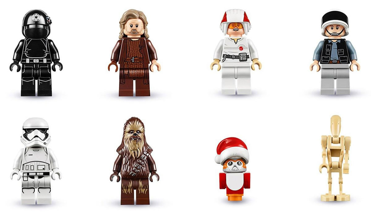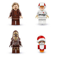 Du côté des figurines, nous aurons droit cette année à un assortiment relativement intéressant avec six minifigs et quelques droïdes et autres créatures : un Death Star Gunner, Luke Skywalker en version Ahch-To, un Cloud Car Pilot, un Rebel Trooper, un First Order Stormtrooper, Chewbacca, un Porg déguisé en Père Noël, un Battle Droid, un Mouse Droid, un Mynock et même un Gonk Droid plutôt festif.