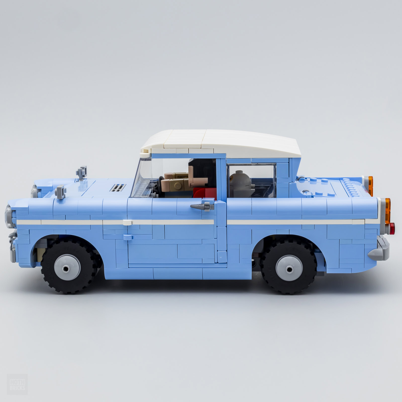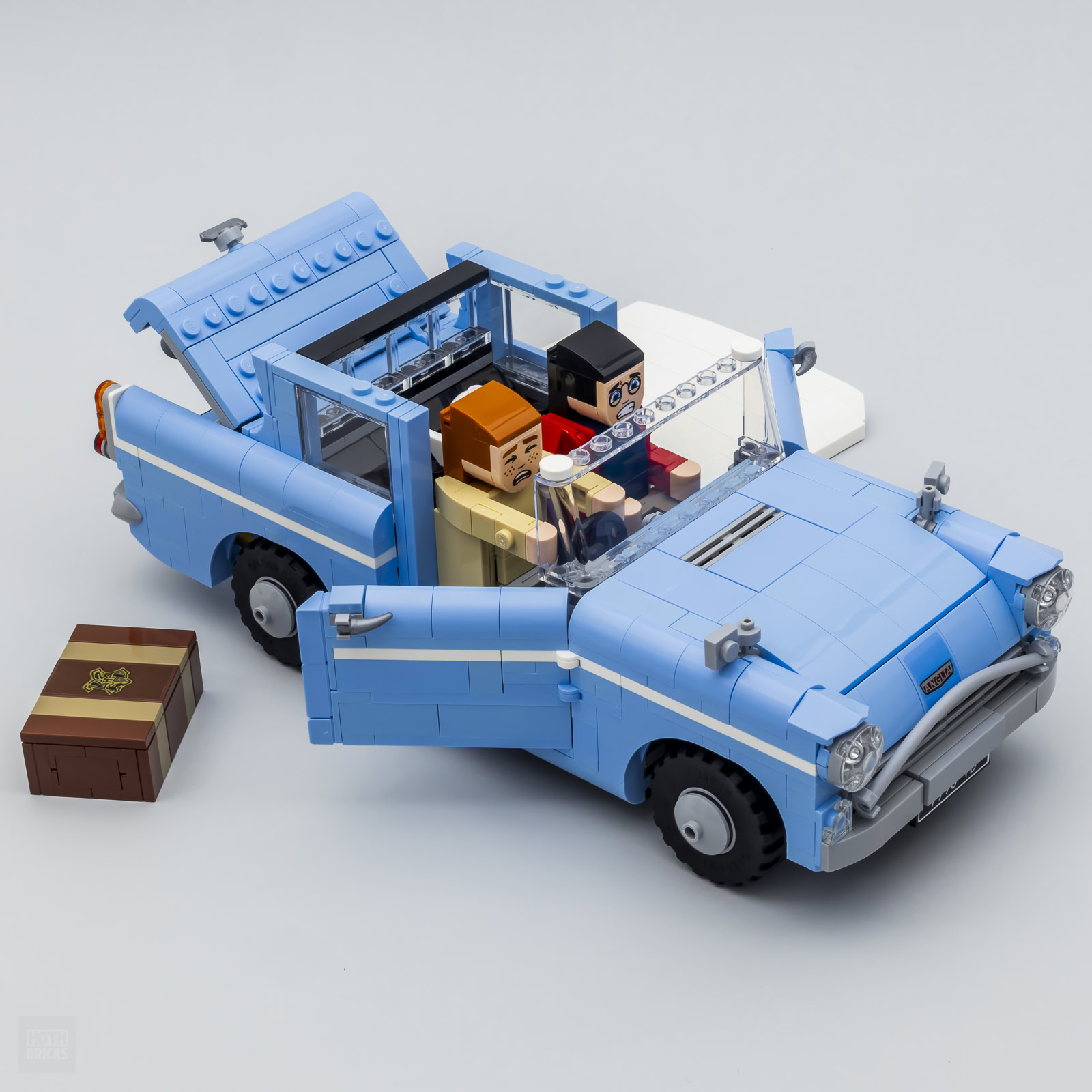 La bonne nouvelle : Il est possible de retirer les deux personnages sans rien démonter et on pourra donc exposer la Ford Anglia comme un véhicule classique, vide de ses occupants au look ridicule. Hedwige est presque réussie en comparaison de l'apparence des deux jeunes étudiants de Poudlard qui ont plus l'air d'être assis sur les toilettes qu'installés dans une voiture.