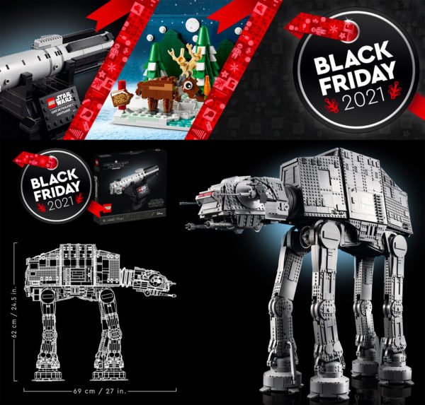 En avant pour un Black Friday 2021 à la sauce LEGO avec quelques offres promotionnelles, le lancement à 01h00 du matin du set LEGO Star Wars 75313 AT-AT (799.99 €) qui permet d'obtenir un exemplaire du set exclusif 40483 Luke's Skywalker Lightsaber et quelques boites proposées à prix réduit. Les offres ci-dessous sont valables du 26 au 29 novembre 2021, dans la limite des stocks disponibles.