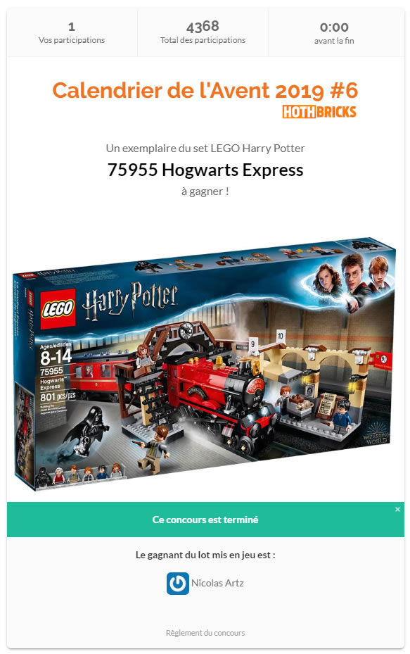 On ne se laisse pas abattre et on enchaîne avec une nouvelle boite à gagner dans le cadre de ce calendrier de l'Avent à la sauce Hoth Bricks : Le set LEGO Harry Potter 75955 Hogwarts Express d'une valeur de 84.99 €. Dans la boite, de quoi assembler le Poudlard Express, mais pas de rails, il faut les acheter séparément. Ce joli set est en rupture un peu partout, voici donc une occasion d'en avoir un exemplaire à mettre sous le sapin et sans rien payer. Difficile de faire mieux.