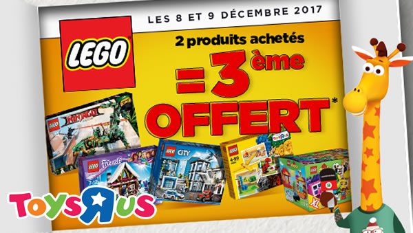 C'est le retour de l'offre "2 produits LEGO achetés, le 3ème offert" chez Toys R Us. Cette offre qui vous permet de ne pas payer le moins cher des trois produits commandés est valable uniquement les 8 et 9 décembre 2017.