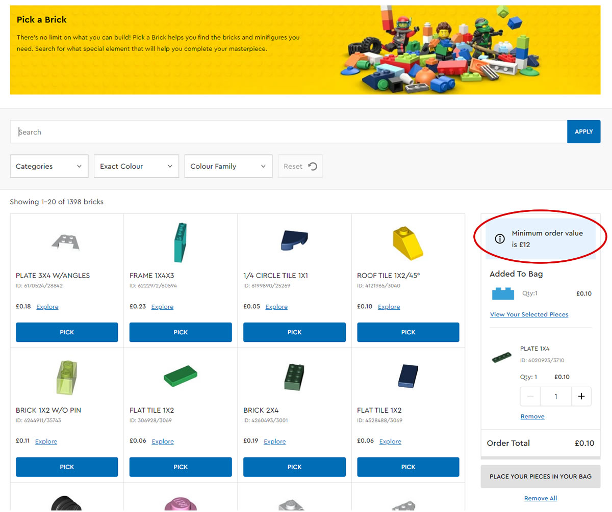 LEGO teste en effet à compter d'aujourd'hui l'instauration d'un minimum d'achat sur le service en ligne "Choisis une Brique" (Pick a Brick) et c'est le Royaume-Uni qui s'y colle en premier avec l'obligation d'atteindre la somme de £12 pour pouvoir profiter du service. L'idée derrière ce test est de s'aligner sur le coût des pots vendus en LEGO Stores (£11.99) et d'alléger au passage la charge de travail des petites mains qui gèrent ces commandes de pièces.
