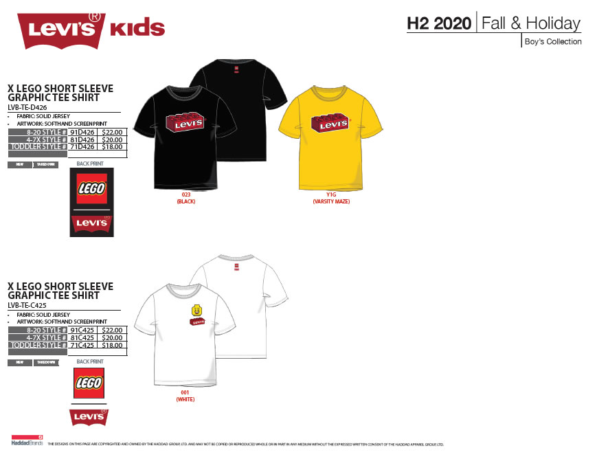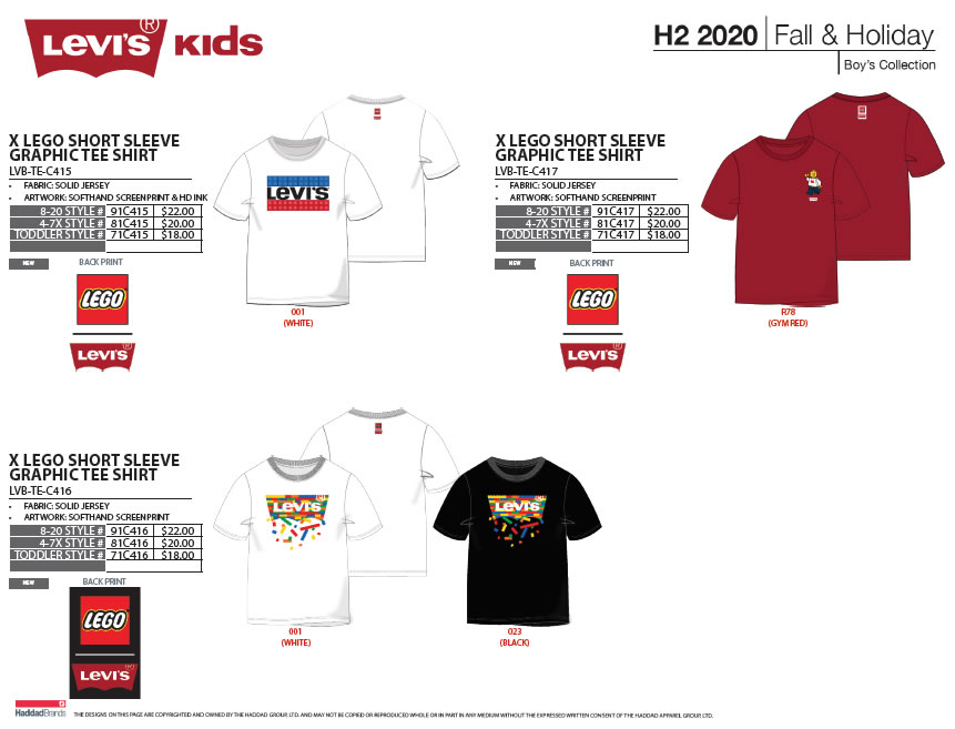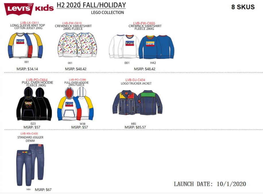 Lancement de la collection dès le 1er octobre prochain sur le site officiel de la marque LEVI'S et en boutiques. La collection enfants sera également disponible sur la boutique officielle en ligne LEGO (voir photos plus bas) à l'exception des 8 produits du dernier slide qui seront réservés à la Chine.