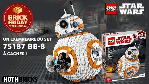 Le Brick Friday, c'est l'occasion de s'offrir quelques sets à un tarif plus raisonnable que d'habitude et de se faire offrir un petit set sympa au passage. Pour marquer le coup, je vous propose de tenter de gagner un exemplaire du très réussi set LEGO Star Wars 75187 BB-8 (Prix public 99.99 €) en participant au concours via le widget ci-dessous.