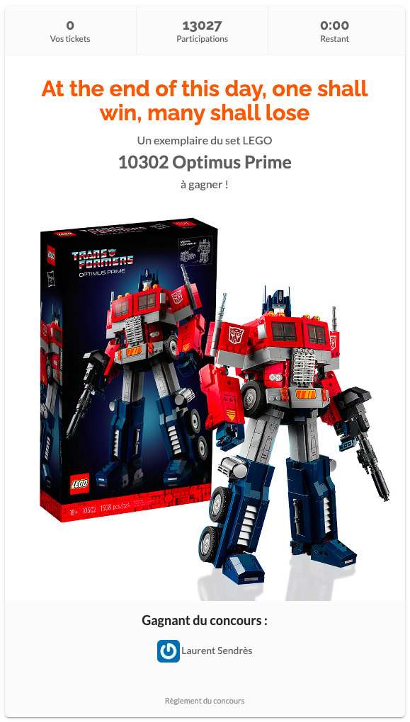 C'est le moment de profiter des vacances des autres pour tenter de gagner des trucs : il y aura comme d'habitude des concours durant l'été et on commence aujourd'hui avec la mise en jeu d'un exemplaire du set LEGO 10302 Optimus Prime d'une valeur de 169.99 €.