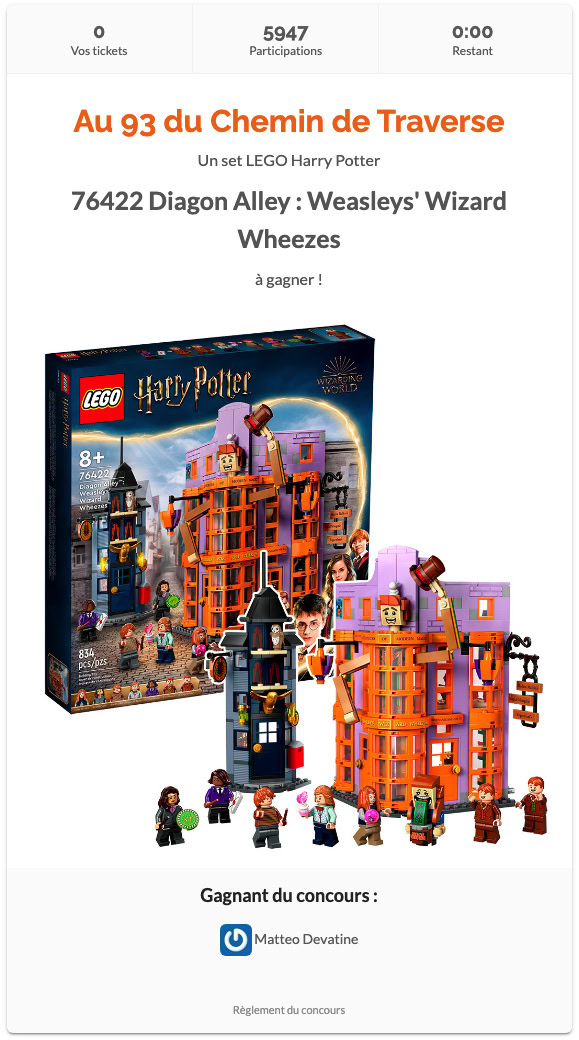 Le lot mis en jeu est généreusement fourni par LEGO France via la dotation annuelle allouée à tous les membres du LAN (LEGO Ambassador Network), il sera expédié au gagnant par mes soins dès confirmation de ses coordonnées par retour de mail.