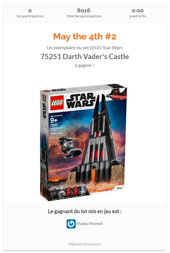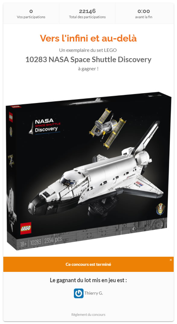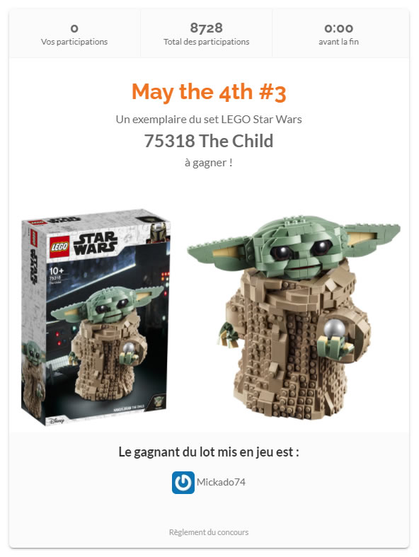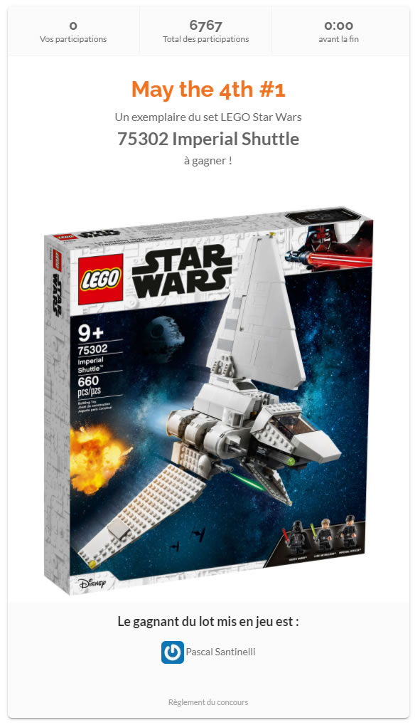 Le lot est fourni par LEGO que je remercie une fois de plus pour sa confiance et son soutien sans faille tout au long de ces années, il sera expédié au gagnant par mes soins et en Colissimo suivi avec assurance et signature à la livraison (et un emballage adapté) dès confirmation de ses coordonnées par retour de mail.