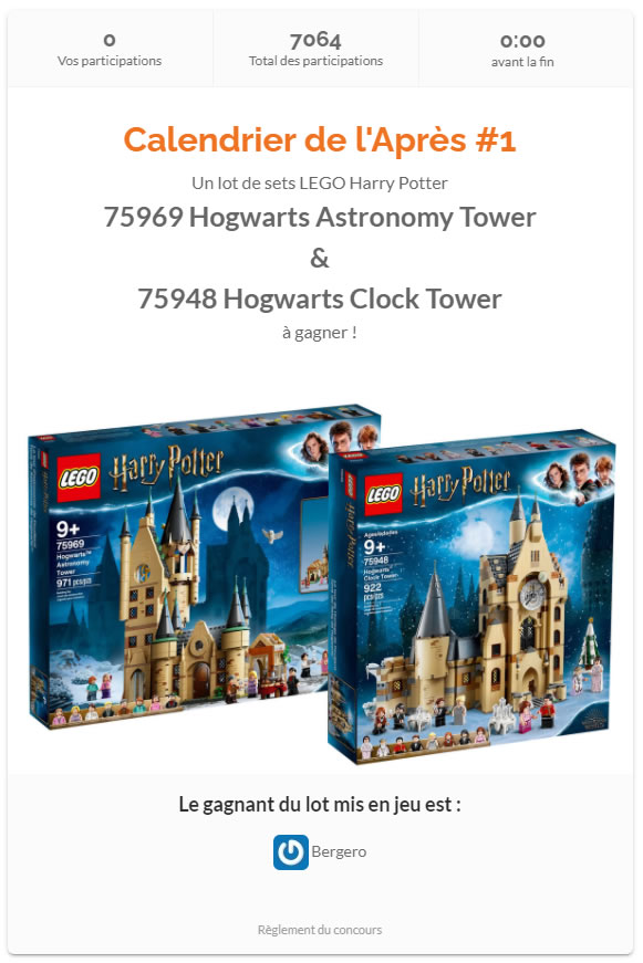 La dotation se répartit comme suit : le grand gagnant du concours recevra 12 sets LEGO de son choix d'une valeur unitaire maximale de 200 € par set. Il recevra un produit chaque mois pendant un an. Les 15 autres gagnants suivants recevront les 4 sets issus de la liste qu'ils auront composé. Le tirage au sort aura lieu le 6 décembre prochain et les lots seront ensuite envoyés aux gagnants entre le 20 décembre 2021 et le 7 mars 2022.