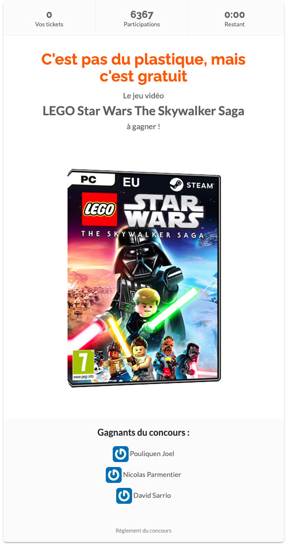Pour information : le nom / pseudo du gagnant s'affiche dans l'interface de participation une fois le tirage au sort effectué. Je préviens aussi les gagnants par email, mais pensez à vérifier quand même.