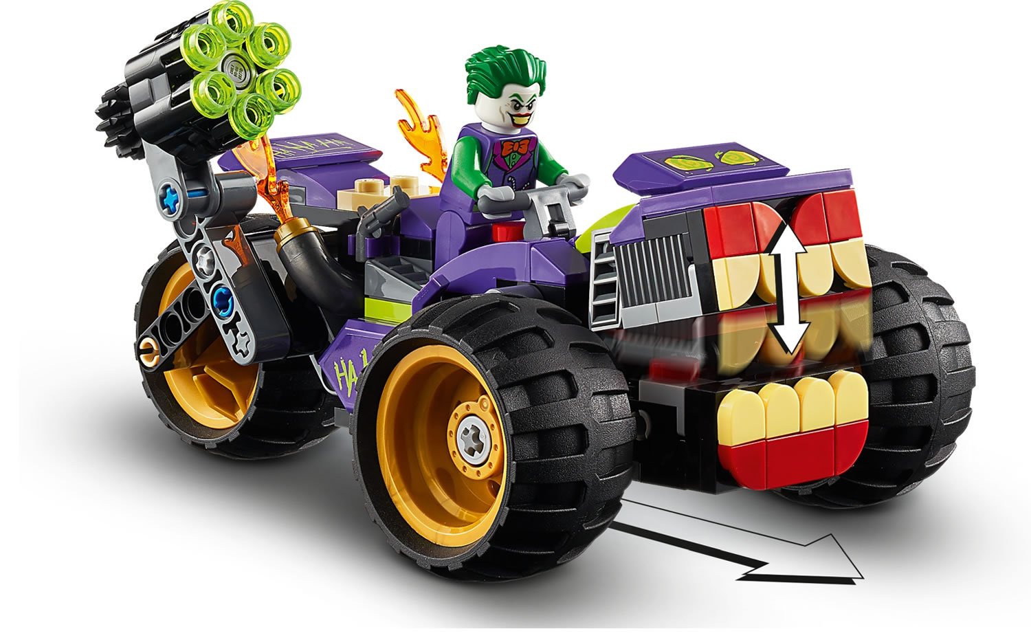 La grosse fonction de ce Trike, c'est l'ouverture de la bouche placée à l'avant lorsque le véhicule est en déplacement. C'est bien réalisé et l'effet est amusant. La position de conduite est moins fantaisiste que ce que LEGO nous proposait récemment pour Spider-Man ou Black Panther sur leurs engins respectifs et Harley Quinn peut se tenir debout ou assise juste derrière le Joker. Vous aurez moins de chance que d'habitude de perdre les deux petits pistolets gris du Joker, ils peuvent être clipsés sur les flancs de la selle du Trike.
