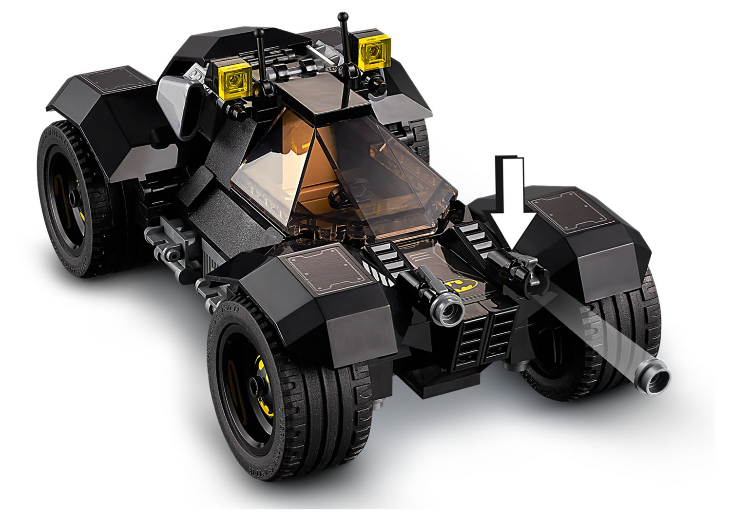 La Batmobile fournie ici est une version sans doute vaguement inspirée de celle vue dans le jeu vidéo Arkham Knight, ultra-simplifiée pour l'occasion. Pas de direction ni de suspensions, mais le résultat est assez intéressant avec un look agressif et un poste de pilotage vraiment spacieux.