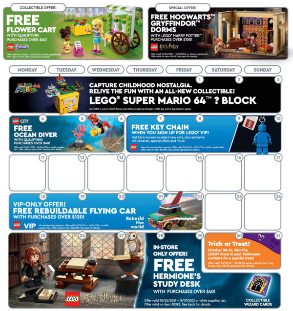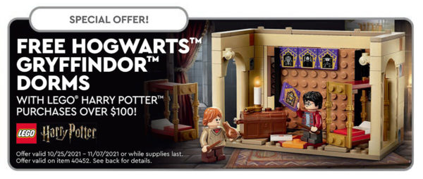 • Du 25 octobre au 7 novembre 2021 :  le set LEGO Harry Potter 40452 Hogwarts Gryffindor Dorms sera offert dès 100$ d’achat en produits de la gamme LEGO Harry Potter. Vous pourrez l'intégrer à votre playset de Poudlard et exposer vos cartes de Chocogrenouilles à collectionner.