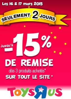 Offre intéressante chez Toys R Us (valable uniquement aujourd'hui 16 mars et demain 17 mars 2015 et exclusivement sur le site internet de l'enseigne) avec une remise de 15% à partir de trois produits achetés.