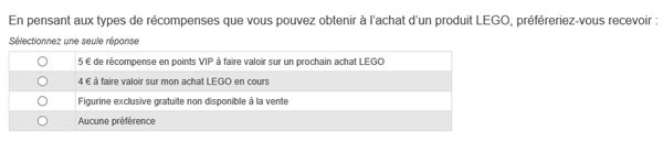 Plus loin, on nous pose une question qui n'a de sens que si on lit attentivement l'intitulé : On y parle d'alternative aux points VIP, pas de complément. La question porte donc sur le remplacement (ou l'échange) des points VIP contre d'autres avantages plus ou moins intéressants dont certains ont toutefois une valeur pécuniaire, comme la livraison gratuite en express ou un cadeau exclusif.