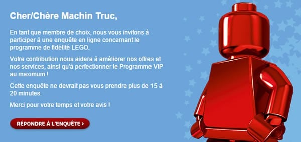 Si vous êtes membre VIP chez LEGO, vous avez reçu un email qui vous propose de répondre à plusieurs questions concernant le programme de fidélité de la marque, son fonctionnement et les avantages offerts afin "d'améliorer votre expérience VIP"...