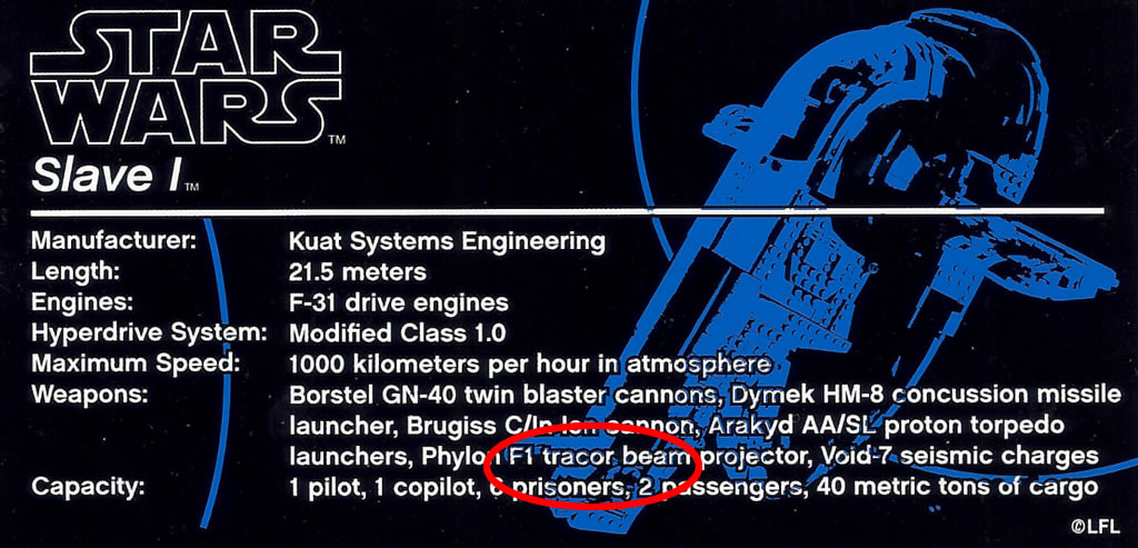 Un Tracor Beam, ça n'existe pas et le Slave I est en fait équipé d'un Phylon F1 Tractor Beam, un équipement qui permet de récupérer un objet ou une personne en l'attirant vers le vaisseau via un flux modifiant la gravité, ou un truc dans le genre.