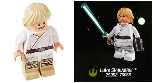 Souvenez-vous, le visuel officiel de la boite met en scène la minifig de Luke Skywalker présente dans les sets 75052 Mos Eisley Cantina et 75059 Sandcrawler sortis cette année, mais le visuel du contenu du set met en scène une minifig hybride dont les jambes sont en fait celles de la minifig exclusive du livre LEGO Star Wars The Visual Dictionary Updated & Expanded (à gauche sur l'image ci-dessus).