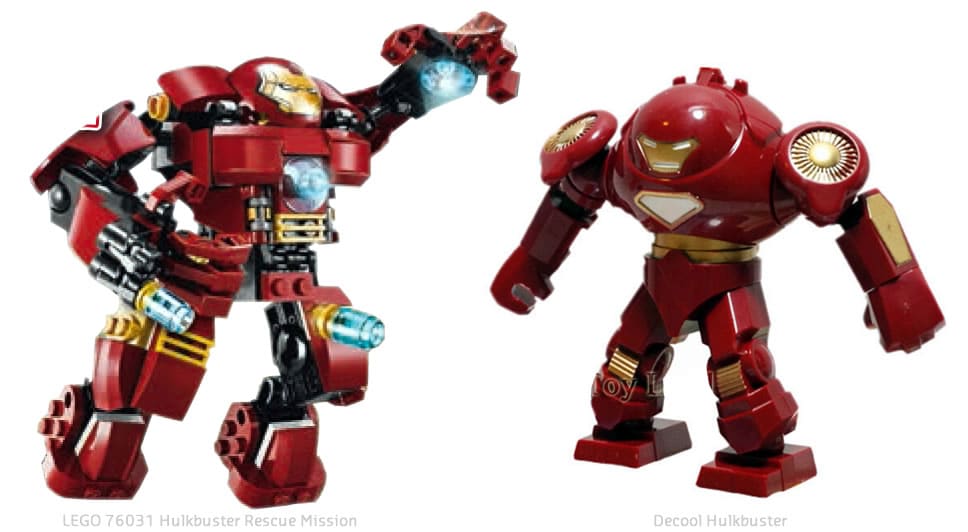 Pendant que nous sommes dans les sets Avengers : Age of Ultron et au vu de vos réactions très partagées dans les commentaires, je me pose une question, ou plutôt deux : Qui de LEGO ou de Decool, le fabricant qui copie sans vergogne de nombreux produits originaux du fabricant et ceux de certains spécialistes du custom, a la meilleure représentation de l'armure Hulkbuster ? Et le choix de LEGO de proposer une version à construire est-il un choix artistique volontaire ou une réaction par dépit au produit proposé depuis plusieurs mois par Decool (Même question concernant la bigfig de Hulk qui passe au vert olive avec un nouveau design) ?