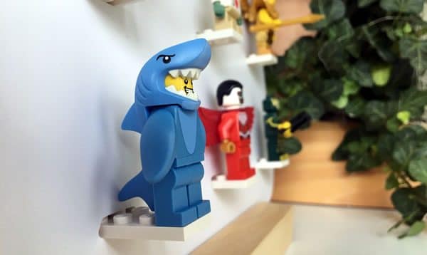 En parlant de l'homme avec un costume de requin, certaines minifigs auront du mal à trouver leur place sur les support prévus. Il faudra ajuster ces derniers pour que les accessoires qui dépassent au dos de la minifig ne gênent pas la mise en place. Rien ne vous empêche d'ailleurs de remplacer les plates 2x3 par des plates 2x4 pour une rangée de studs supplémentaire d'écart entre la minifig et le plateau.