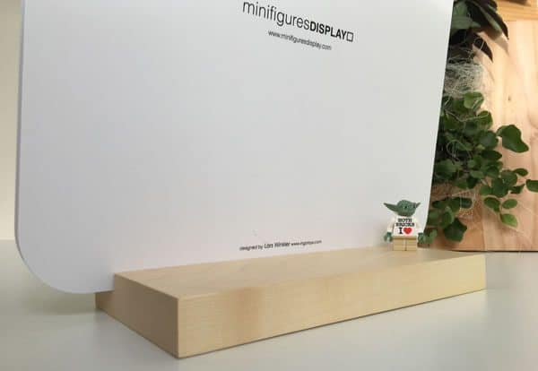 Le socle est en bois d'érable et le plateau de 28 cm de côté pour les minifigs est en PVC expansé. 16 plates 2x3 blanches sont fournies, elles viennent se loger dans les trous prévus pour servir de base aux minifigs exposées. La découpe du plateau en PVC est correcte, même si les angles arrondis auraient pu bénéficier d'un peu plus de soin : l'arrondi n'est pas parfait.