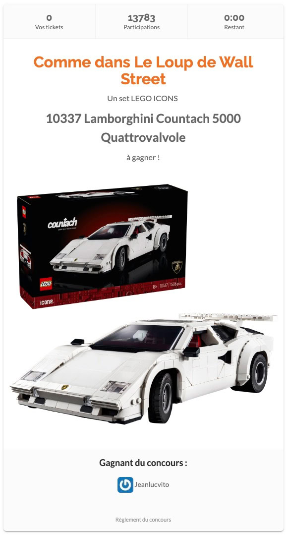 Le lot d'une valeur de 119,99 € mis en jeu est généreusement fourni par LEGO, il sera expédié au gagnant par mes soins dès confirmation de ses coordonnées par retour de mail.