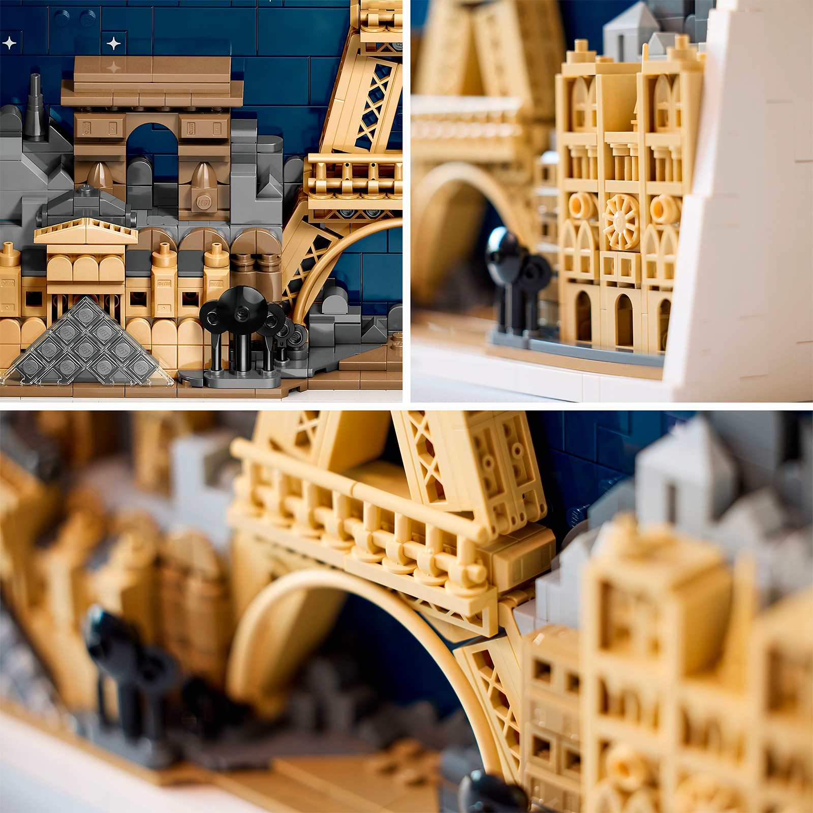 Du côté de l'assemblage, on retrouve ici quelques séquences inspirées des sets traditionnels de la gamme LEGO Architecture avec une flopée de pièces 1x1 utilisées pour symboliser les détails architecturaux des monuments mis en scène. Notre-Dame est réussie tout comme l'Arc de Triomphe, le Louvre est vaguement suggéré avec sa paresseuse pyramide et la Tour Eiffel ne profite pas vraiment de l'échelle à l'œuvre ici avec un résultat à mon avis à la fois un peu trop grossier dans le design et hors-sujet par la teinte.