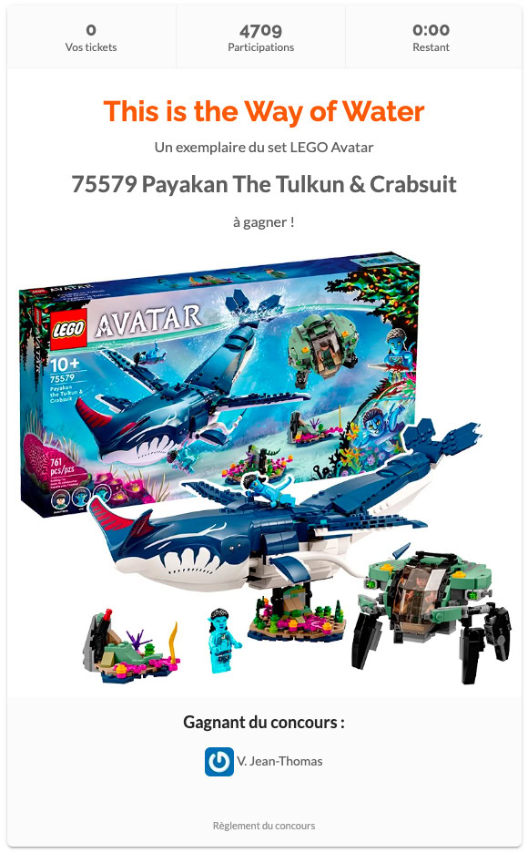 On enchaîne aujourd'hui avec la mise en jeu d'un exemplaire du set LEGO Avatar 75579 Payakan the Tulkun & Crabsuit (99.99 €), une boite de 761 pièces qui devrait plaire aux fans du film Avatar The Way of Water.
