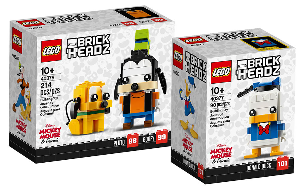 Le serveur qui héberge les visuels des produits LEGO en vente sur la boutique officielle en ligne a été mis à jour et c'est donc l'occasion de découvrir deux nouvelles références de la gamme BrickHeadz : les sets Disney 40377 Donald Duck (90 pièces - 9.99 €) et 40378 Pluto & Goofy (214 pièces - 14.99 €). Pour ceux qui ne le savent pas, Goofy, chez nous, c'est Dingo.