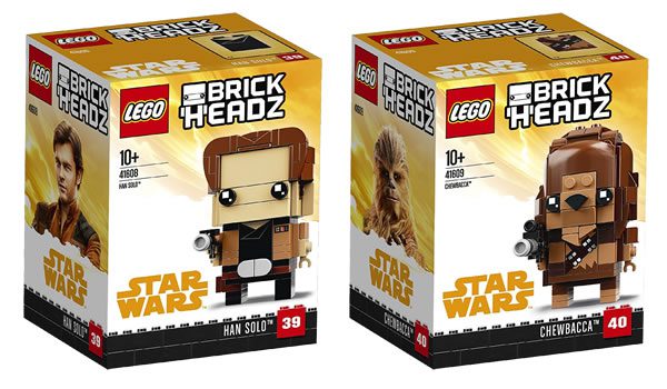 Pour accompagner la demi-douzaine de sets et les deux Buildable Figures basés sur le film Solo : A Star Wars Story, nous aurons également droit dès le 1er avril prochain à deux figurines BrickHeadz dont voici les visuels officiels mis en ligne par amazon : Le jeune Han Solo (141 pièces) et Chewbacca (149 pièces). Prix public : 9.99 €.