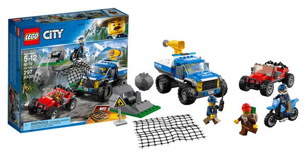 On sait que la gamme City accueillera en 2018 une série de sets mettant en scène comme d'habitude des policiers et des bandits. L'année prochaine, l'action se passera notamment en montagne avec quelques boites parmi lesquelles les références 60174 Mountain Police Headquarters et 60172 Dirt Road Pursuit.