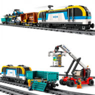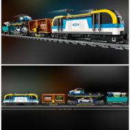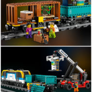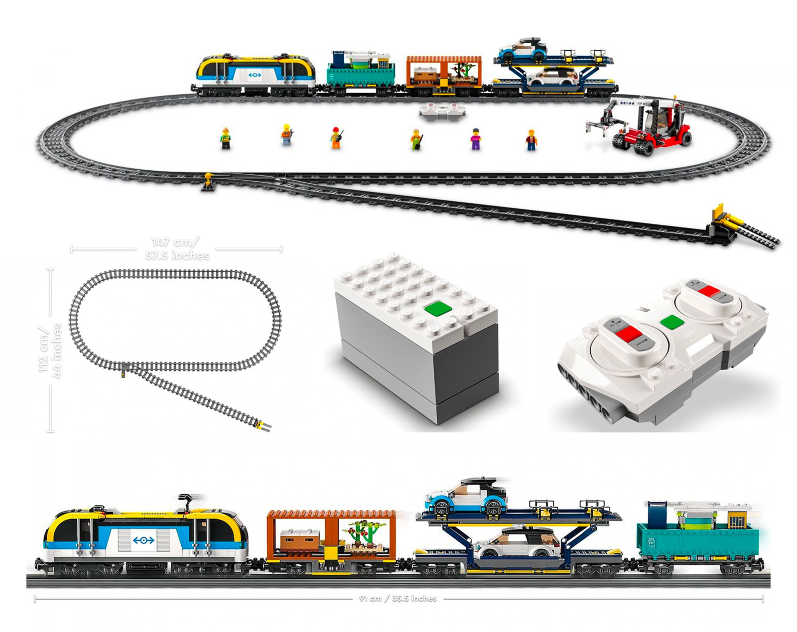 Au programme, 1153 pièces et 6 minifigs avec un train de marchandises se composant d'une locomotive, de trois wagons, de deux véhicules à charger sur le wagon de queue, d'un engin de chargement et d'un circuit complet de rails avec 33 segments (16 rails droits, 16 courbes et un aiguillage). Le train sera motorisé via l'écosystème Powered Up sans devoir repasser à la caisse.
