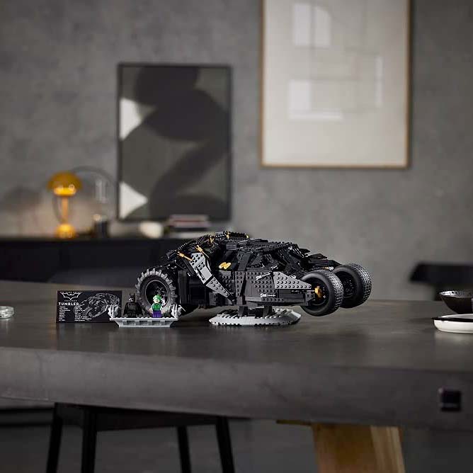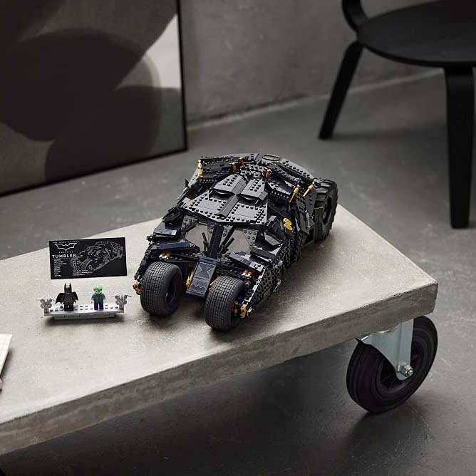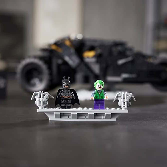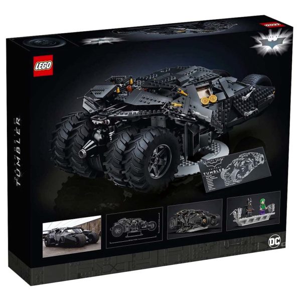 Cette nouvelle version du Tumbler prendra le relais de celle du set 76023 The Tumbler commercialisée en 2014 avec au passage quelques subtiles modifications du design du véhicule. Le Tumbler est ici exposé sur un support rotatif flanqué d'une petite plaque de présentation, il mesure 45 cm de long, 25 cm de large et 16 cm de haut. Batman et le Joker accompagnent le Tumbler dans cette nouvelle boite, les deux minifigs inédites sont présentées sur une corniche de toit identique à celles déjà vues dans les sets 76139 1989 Batmobile et 76161 1989 Batwing.