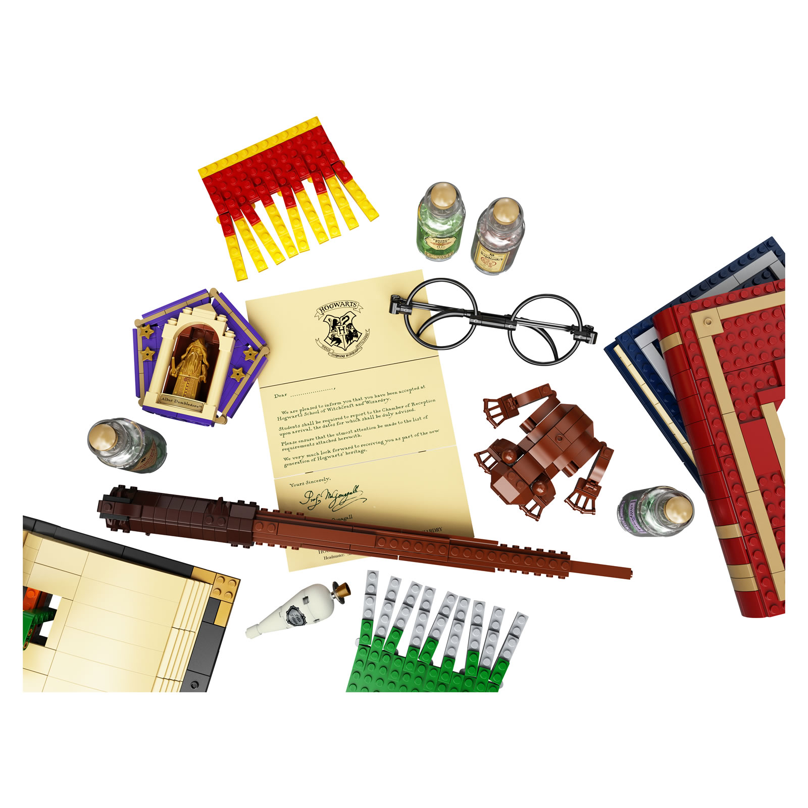 Lettre d'admission à Poudlard tampographiée et personnalisable, baguette et lunettes de Harry Potter, chocogrenouille, caisse de potions d'Hermione Granger avec fioles recouvertes de stickers, Journal de Tom Jedusor (Tom Riddle), Vif d'or (Golden Snitch) et franges d'écharpe de la maison (Gryffondor, Poufsouffle, Serdaigle ou Serpentard) à choisir en fonction de vos affinités, tout y est ou presque.