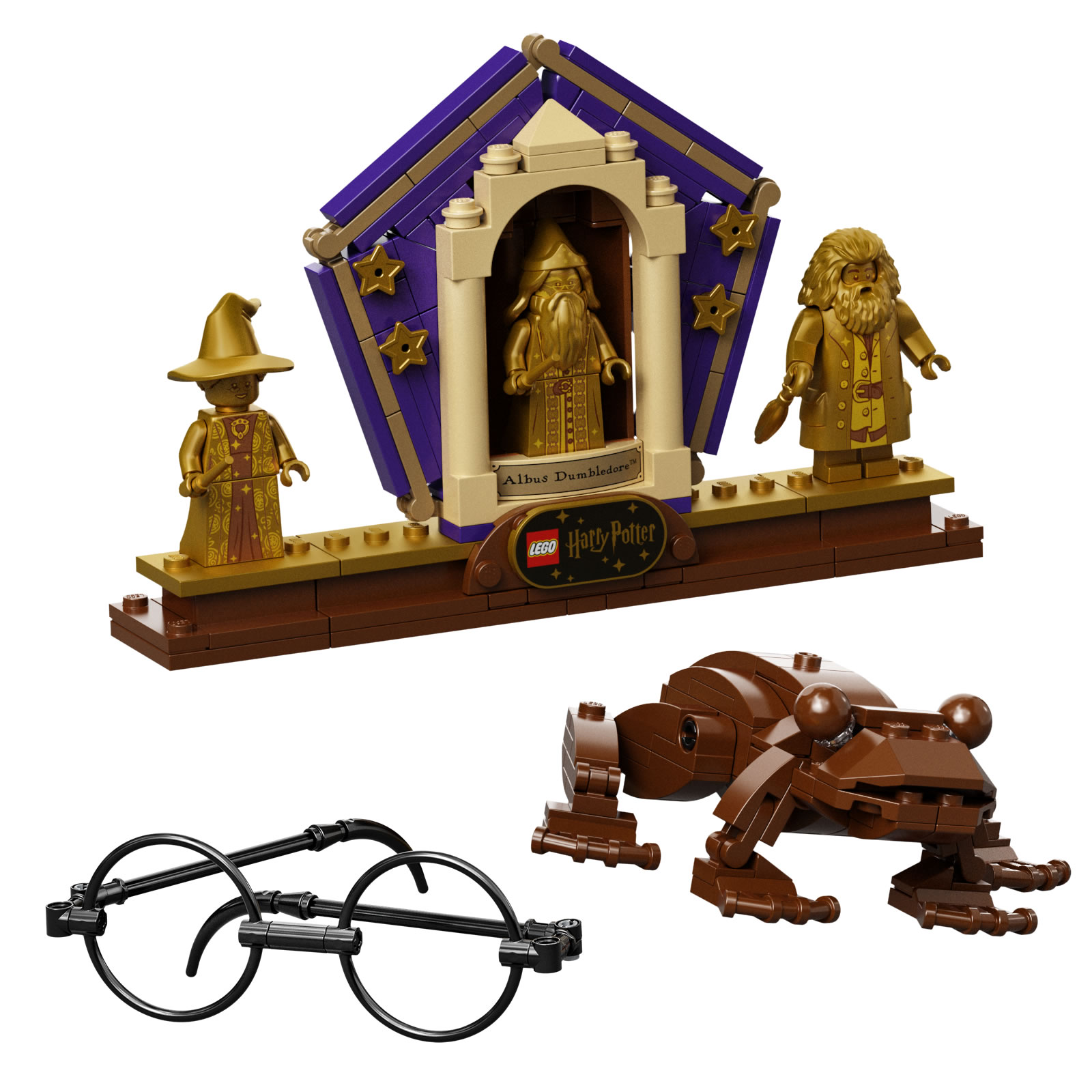 En bonus, LEGO inclut un présentoir en forme de carte de chocogrenouille avec Tile tampographiée et trois minifigs dorées à collectionner, Albus Dumbledore, Minerva McGonagall et Rubeus Hagrid, qui viennent rejoindre les six déjà disponibles dans les sets 76386 Hogwarts : Polyjuice Potion Mistake (Harry Potter), 76387 Hogwarts : Fluffy Encounter (Hermione Granger), 76388 Hogsmeade Village Visit (Ron Weasley), 76389 Hogwarts Chamber of Secrets (Voldemort), 76392 Hogwarts Wizard’s Chess (Severus Snape) et 76395 Hogwarts : First Flying Lesson (Professor Quirinus Quirrell).