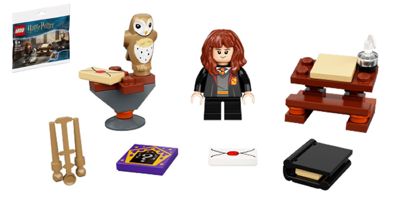 Dans le sachet, une minifig d'Hermione Granger avec le torse vu sur la minifig de Harry Potter dans le set 76389 Hogwarts Chamber of Secrets, une chouette qui est également dans le set commercialisé depuis le mois de juin, quelques accessoires et une carte Chocogrenouille aléatoire.