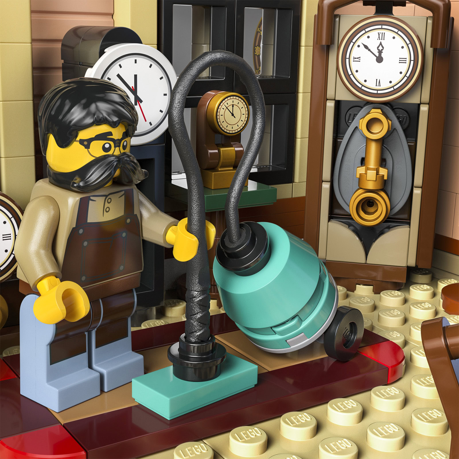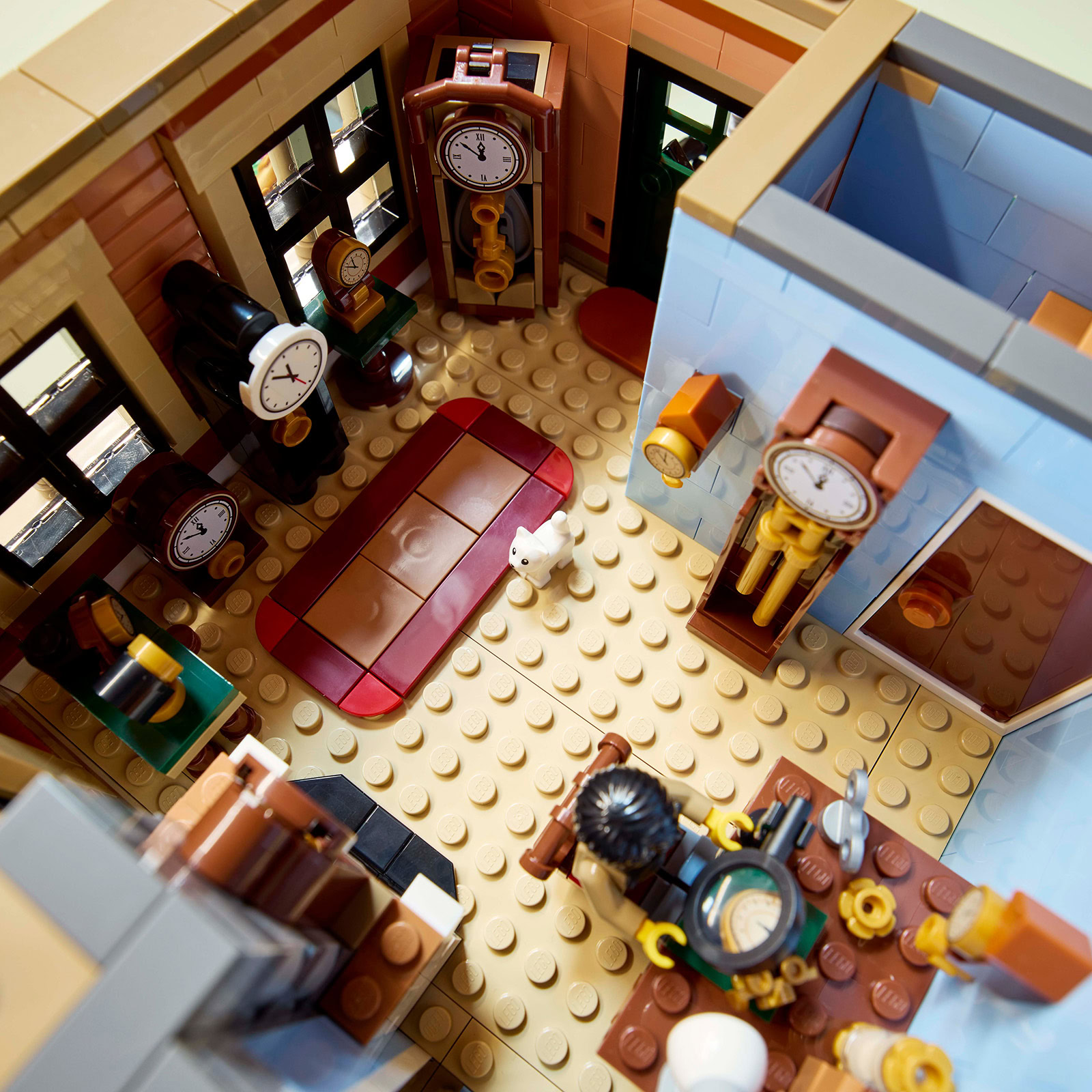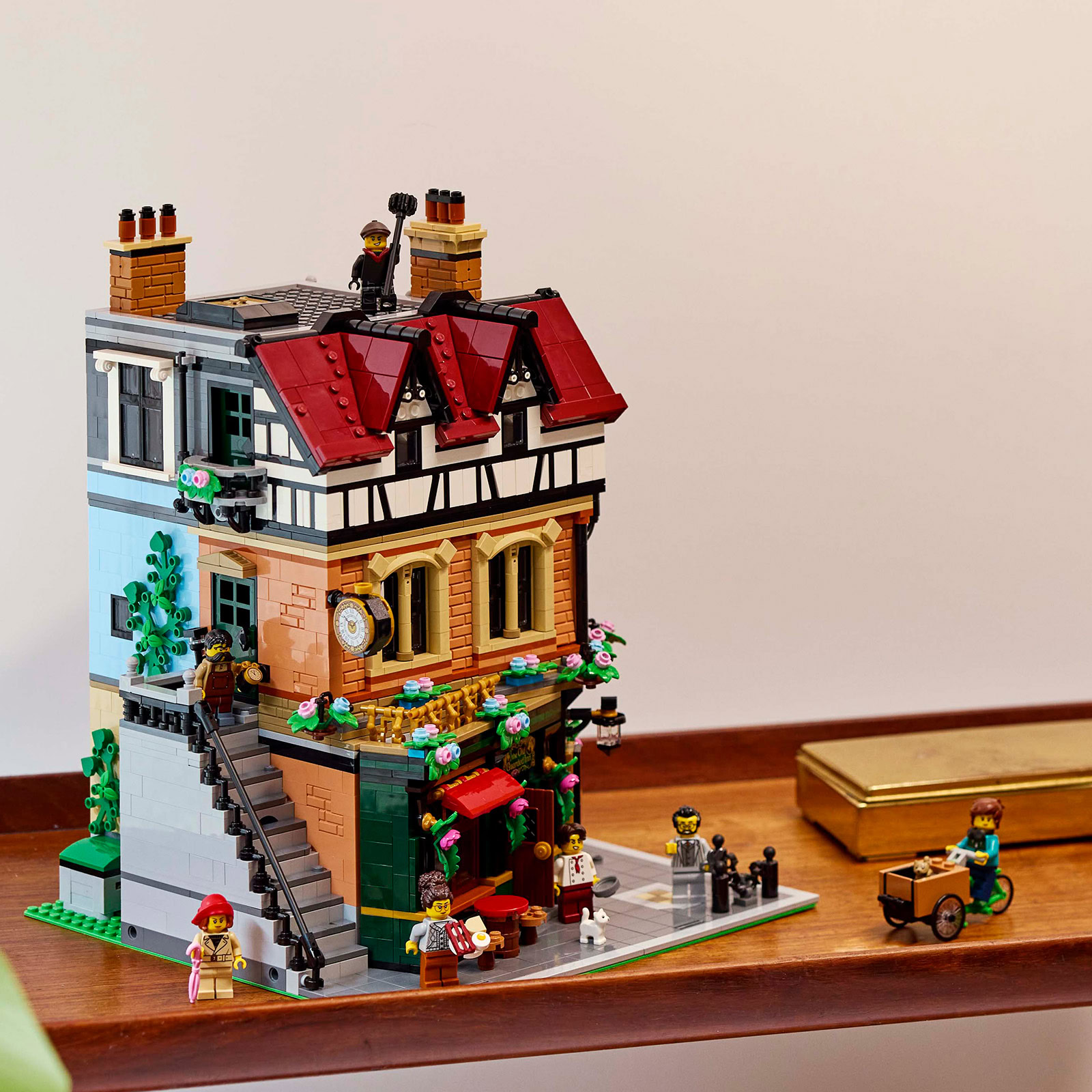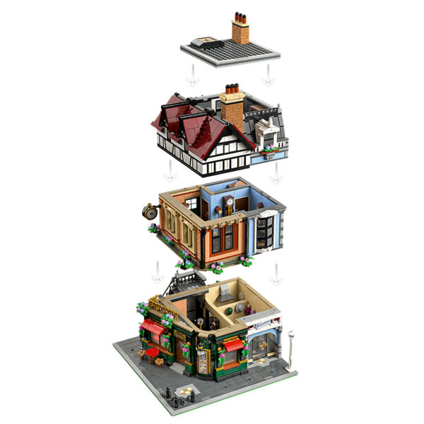 Dans la boite, 3266 pièces pour assembler la construction de 31 cm de haut sur 26 cm de large et 25 cm de profondeur qui rassemble un restaurant, une mercerie, un atelier d'horlogerie ainsi qu'un appartement mansardé. Le bâtiment est peuplé de 8 minifigs dont un chef cuisinier et un ramoneur.