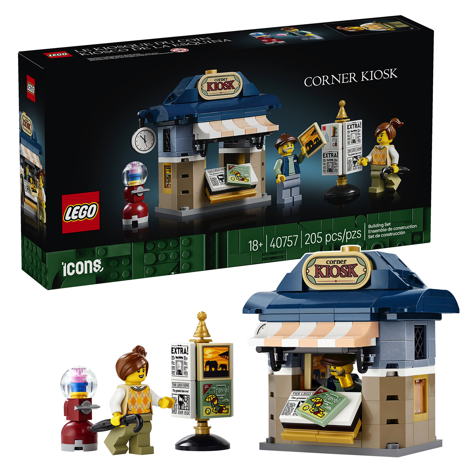 Ce produit sera accompagné du petit set promotionnel LEGO ICONS 40757 Corner Kiosk qui sera offert à tous ceux qui passeront à la caisse entre le 1er et le 7 janvier 2025. L'inventaire de cette petite boite permettra d'assembler un kiosque vintage accompagné de 2 minifigs ainsi que quelques éléments de mobilier urbain.