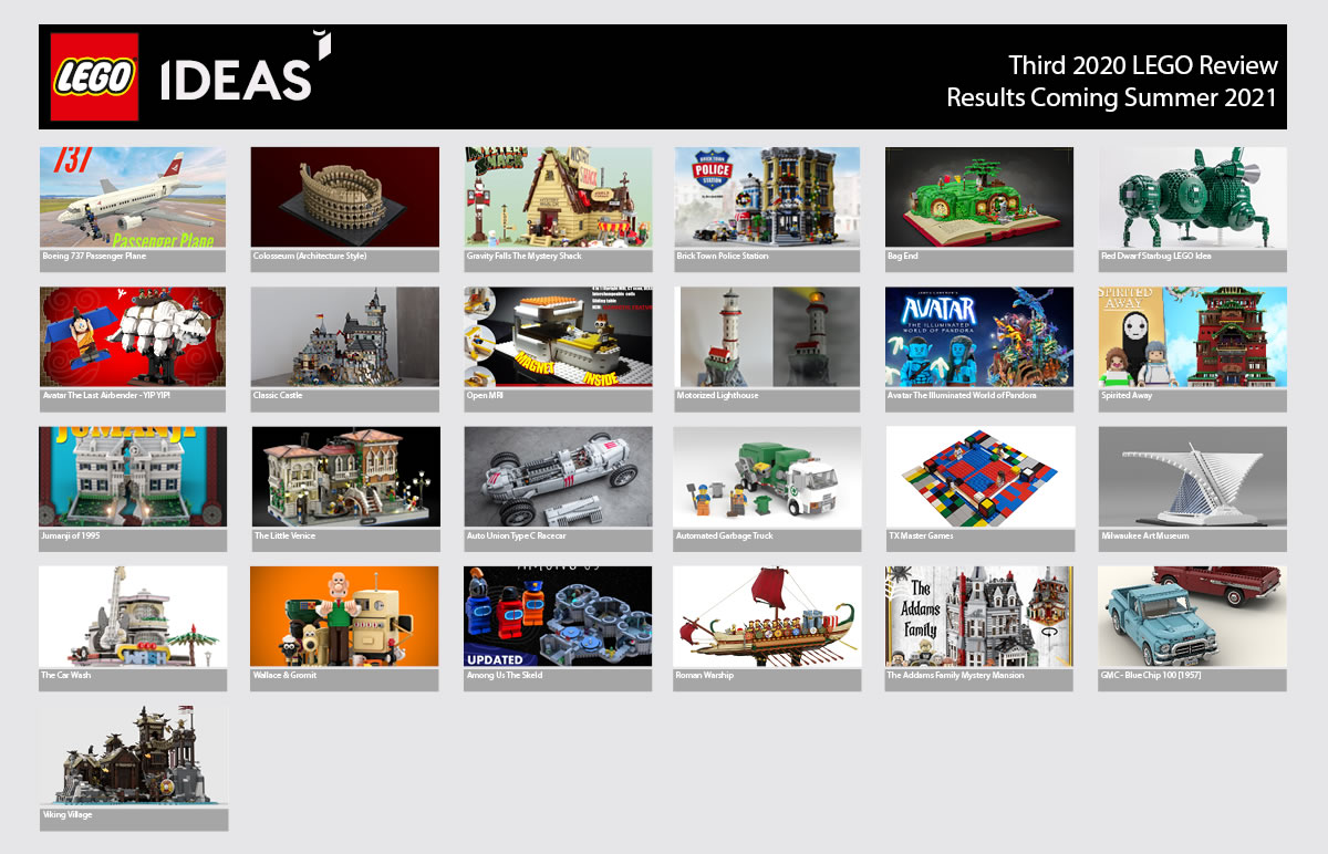 LEGO ne prend même pas la peine de faire un pré-tri post-validation et on retrouve dans cette sélection un Colisée qui passera évidemment à la trappe en raison de la commercialisation du set 10276 Colosseum, un commissariat Modular qui lui aussi sera rejeté d'office suite à la mise en vente du set 10278 Police Station, une nouvelle version de la maison des hobbits déjà vue en 2013 dans le set 79003 An Unexpected Gathering, une machine à IRM, un jeu de plateau sur le thème du karaté auquel personne n'a jamais rien compris, une reproduction du Milwaukee Art Museum, une benne à ordures, un Boeing 737 et les inévitables projets s'appuyant sur des licences comme Wallace & Gromit, le jeu vidéo Among Us, Avatar, l'autre Avatar, La Famille Addams, Jumanji, Red Dwarf, Gravity Falls ou encore Le Voyage de Chihiro. La liste détaillée des projets concernés est disponible sur le blog de la plateforme LEGO IDEAS.