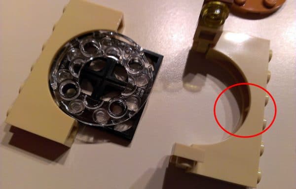 Il s'avère que le set de la gamme LEGO The Hobbit 79003 An Unexpected Gathering est livré selon les boites avec deux types d'arches (Tan Brick, Arch 1 x 6 x 2 - 4114073 sur les instructions du set) différentes destinées à l'assemblage de la fenêtre de la maison de Bilbo : Certaines de ces arches sont en effet dotées d'une butée plastique permettant de maintenir les éléments enfermés entre deux de ces pièces et d'autres ont simplement un rainurage vide à cet endroit. L'absence de cette butée induit un flottement de quelques millimètres des éléments de la fenêtre qui est pour certains assez désagréable.