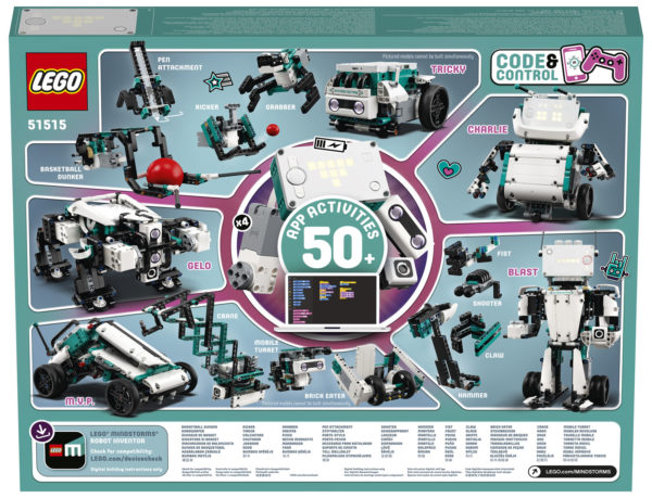 Dans la boite, 949 pièces pour assembler à tour de rôle cinq robots aux capacités différentes et créer ses propres modèles avec notamment un nouveau hub intelligent, un capteur de couleurs (8 couleurs) / luminosité, un capteur de distance avec des "yeux" programmables et un adaptateur 6 broches pour capteurs additionnels, quatre moteurs avec capteur de rotation et positionnement absolu, un exemplaire en Teal (Bleu canard) de la nouvelle plaque Technic 7x11, et de nouvelles roues. Le hub et les quatre moteurs M sont identiques à ceux présents dans le set LEGO Education 45678 Spike Prime (399.99 €), seul la couleur de l'habillage change.