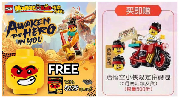 Pendant que nous devons nous contenter du petit set 40355 Year of the Rat offert actuellement dès 80 € / 90 CHF d'achat en produits de la nouvelle gamme LEGO Monkie Kid, le fabricant régale ses clients en Asie avec quelques cadeaux aux couleurs de la gamme que les collectionneurs les plus "complétistes" devront probablement approvisionner via le marché secondaire.