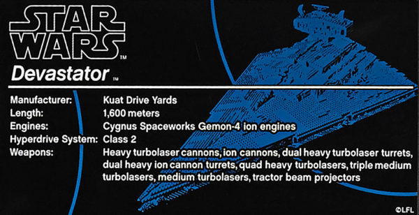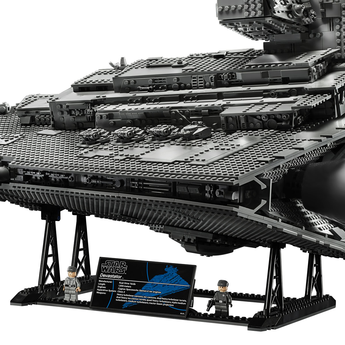 Le set prend enfin le relais de la référence 10030 UCS Imperial Star Destroyer commercialisée en 2002 puis retiré des rayons en 2008. Que les inquiets se rassurent, ce nouveau set intègre bien le club très fermé des références estampillées Ultimate Collector Series, c'est écrit en gros sur la boite et LEGO fournit un joli sticker précisant au passage qu'il s'agit bien du Devastator et qu'il y a plein de turbolasers partout.