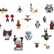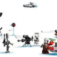 Dans la boite de 335 pièces aux couleurs de la série The Mandalorian, 7 figurines avec Din Djarin (The Mandalorian) et Grogu tous deux en tenues festives et exclusives, un Scout Trooper, un Stormtrooper, un Tusken Raider et les droïdes IG-11 et IT-O.